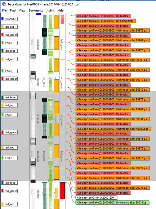 显示软件跟踪的输出示例(图 3)。开发人员可以使用这些工具来检测诸如优先级转换、死锁、线程饥饿以及许多在复杂系统中可能遇到的其他问题。每个任务都有一条生命线,显示其何时就绪、何时执行、何时完成,以及在此期间可能发生的任何事件,例如发出和接收信号。