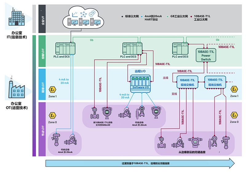 下图显示从4 mA到20 mA以及HART接口过渡到基于10BASE-T1L工业以太网的过程。