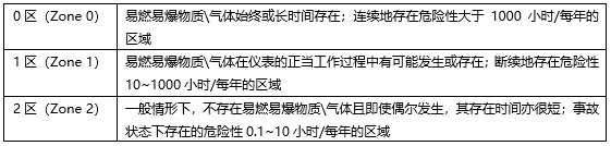 表1:危险区域等级的划分(根据国际电工委员会/欧洲电工委员会)