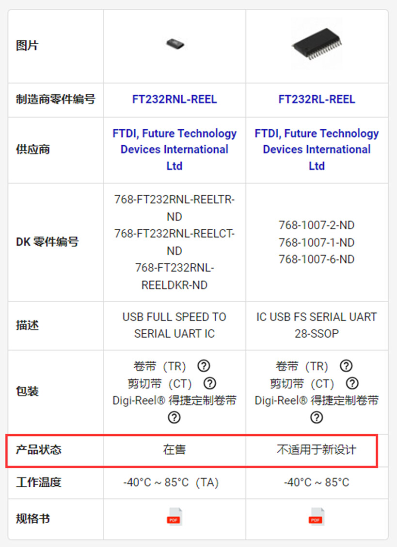 例如,见下面的零件编号 FT232RNL-REEL 和 FT232RL-REEL 的比较表: