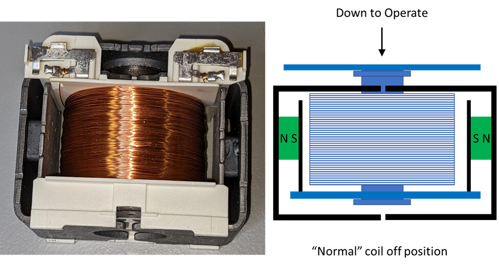 至于本说明开头提到的束缚作用,答案在图3左图中有所提示。永磁体的磁通量倾向于将衔铁保持在断电状态。操作者强制继电器时会感受到张力,并在强制接触器时突然释放。衔铁确实会感觉像是被束缚住了。然而,正如本文所展示的那样,事实并非如此。相反,这种明显的“粘性”是一个巧妙的设计特点。