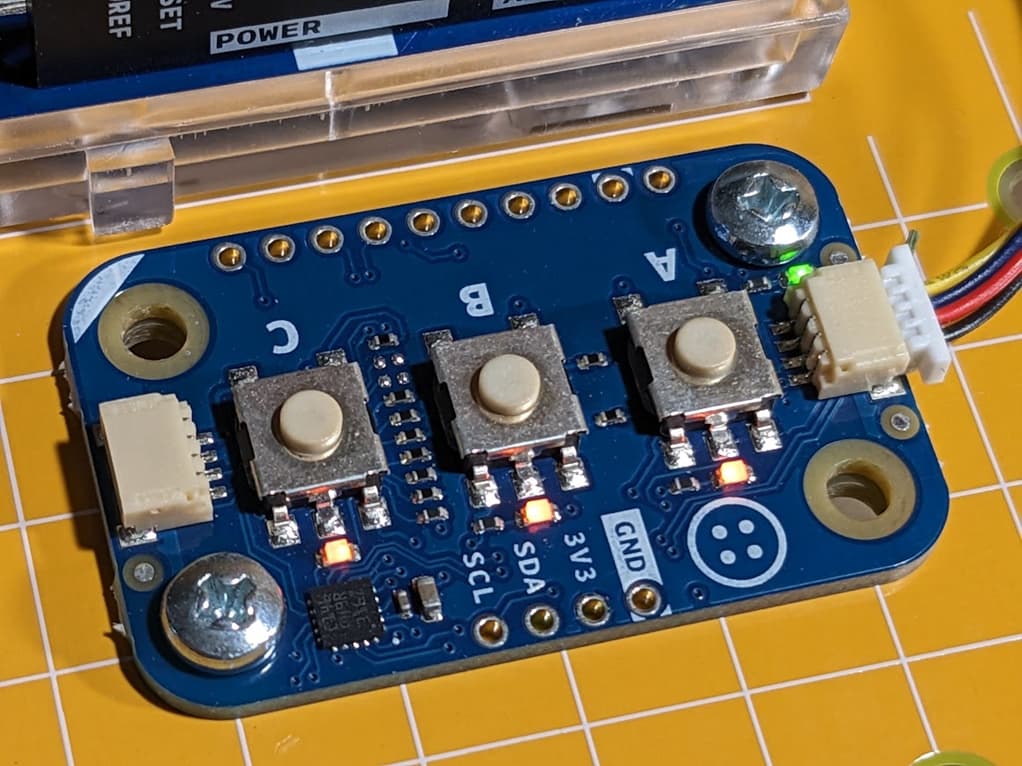图 1 :Arduino Modulino 板的图像,展示了三个按钮和三个独立控制的 LED。微小的32位STM ARM微控制器在左下角可见。该 Modulino 固定在即插即用套件的底座上。