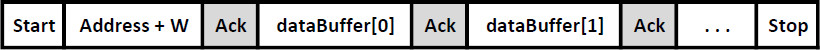调用此函数生成的 I2C序列如下所示。阴影区域表示信号由从设备驱动的位置。在这种情况下,从设备仅确认其自身地址(加上写位)以及随后的任何数据字节。请注意,发送的数据字节数由提供给函数调用的Size参数决定。