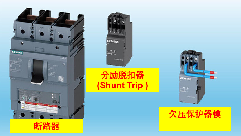 图 2:大型Siemens 断路器,及分励脱扣器(Shunt Trip )和欠压保护器模块的图片。