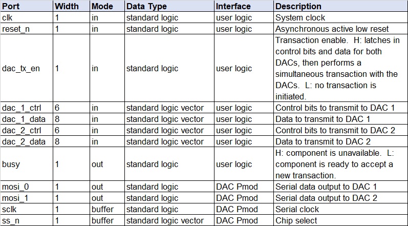 DAC Pmod控制器通过其busy 口输出指示其可用性。当busy 信号为’0’时,控制器准备接受发送到DAC Pmod的事务。置位dac_tx_ena 输入会锁存dac_1_ctrl、dac_1_data 、dac_2_ctrl 和dac_2_data 上的当前值。一旦锁存,控制器会置位busy信号,表示正在进行事务,当前不可用。当事务完成时,控制器再次取消busy 信号的置位,表示已准备好接受下一个请求。