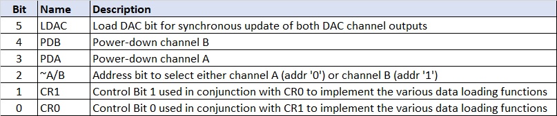 AD7303的两个通道通过发送控制字节和数据字节进行控制。由于Pmod DA1始终使用内部电压基准,此处仅展示控制字节的低6位。表1列出了控制位及其功能。表2展示了加载功能的真值表。表3说明了如何实现掉电功能。