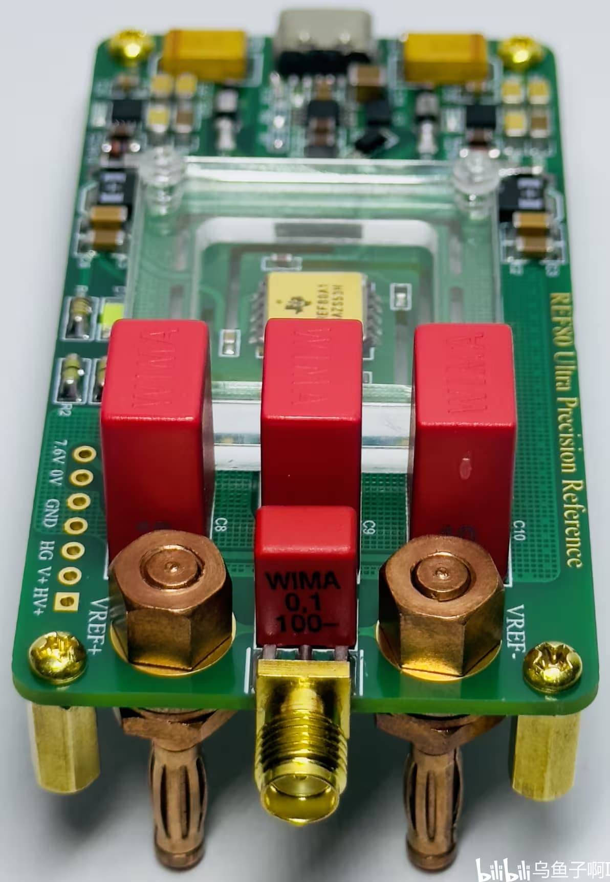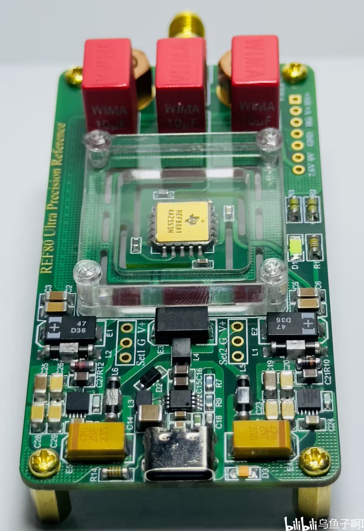 其次是“热岛”的设计。由于REF80的热阻很低,只有103.6℃/W,因此PCB需要通过连续重复开槽的方式来隔热以增加热阻,即在PCB上形成一个“热岛”。同时为了减少“热岛”上的热量向其他方向上进行扩散,我使用亚克力板设计了一个隔热防风罩,将“热岛”包裹起来,这样既减少了“热岛”上热量的损失又减小气流扰动带来的影响。为减小外界干扰,我在“热岛”上靠近芯片的位置添加了电源旁路电容和输出滤波电容,并使用磁珠将电源地与基准的负极隔离开。由于REF80默认的恒温温度高达115℃,因此“热岛”上所有的器件都使用进口的含银高温锡丝进行焊接,避免焊料因高温发生疲软改变芯片的受力进而影响输出的稳定性,并且考虑高温带来的使用寿命问题,外围元件我都使用TDK和muRata的车规级元器件,其工作温度可高达150℃,具有很好的稳定性。