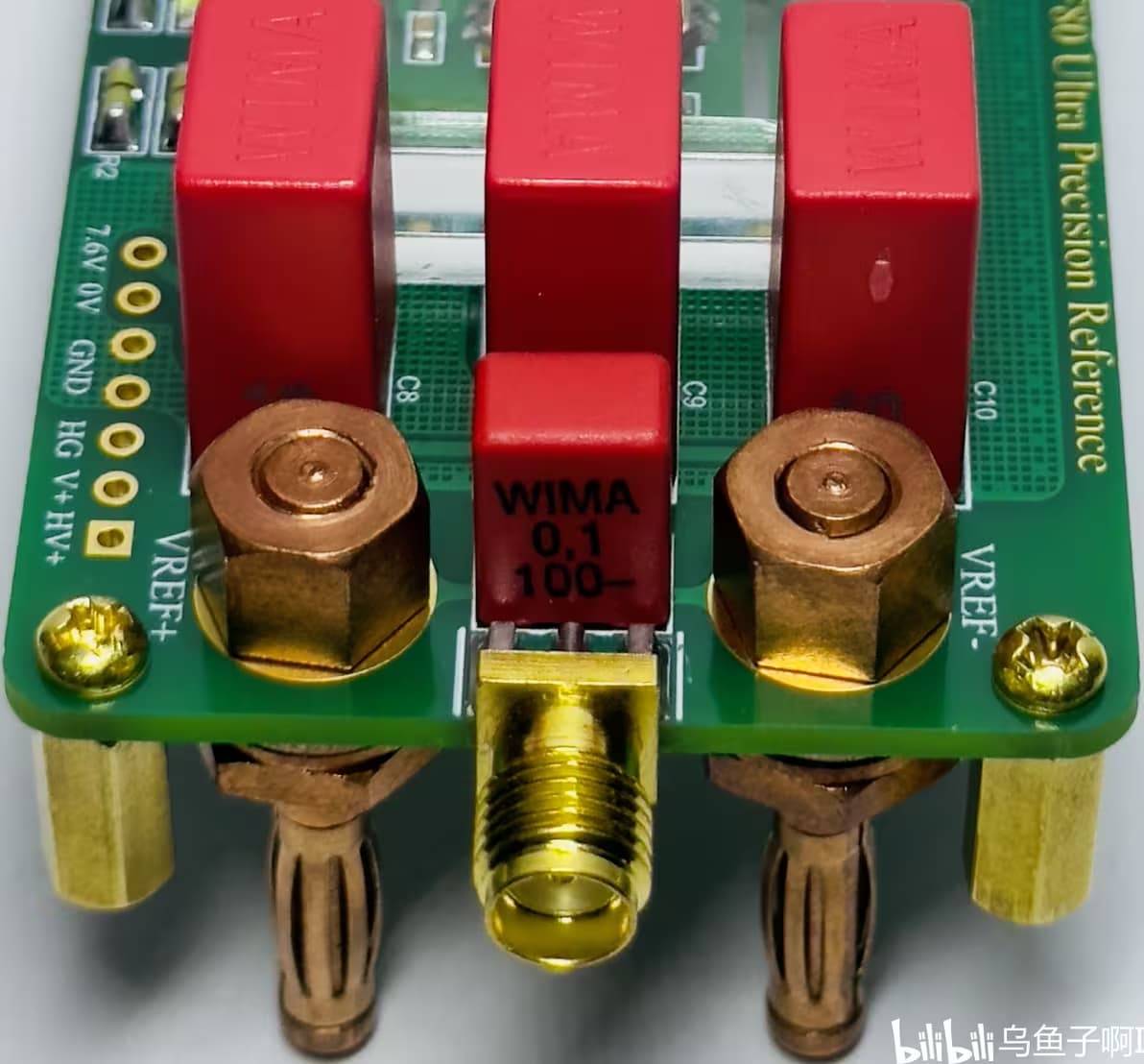 最后是基准电压输出部分的设计。按照官方的说法,输出需要安装容量为10uF-100uF、ESR为10mR-400mR的1类滤波电容,我这里为了对称美观用了3颗10uF的WIMA薄膜电容并联,在靠近输出终端的位置并上了一颗0.1uF的薄膜电容,输出电容串联电阻到地平面,可以通过改变串联电阻值来设置合适的ESR。在输出连接器的选择上,我使用了两种输出端子分别应对不同类别的测试,一种是SMA端子,方便连接到放大器和示波器对基准芯片的输出噪声进行测试;另一种是冷压香蕉头端子,方便连接到万用表中对基准电压的稳定性进行监测,这里香蕉头我用的是以碲铜为主体的低热香蕉插头,最大程度地降低塞贝克效应,并且端子的中心间距设置的是19mm标准间距,可以将模块直接插到万用表的输入测量端口上,这样简化了万用表与模块之间的连接过程,方便用户对模块进行测试,也减小了不必要的干扰。