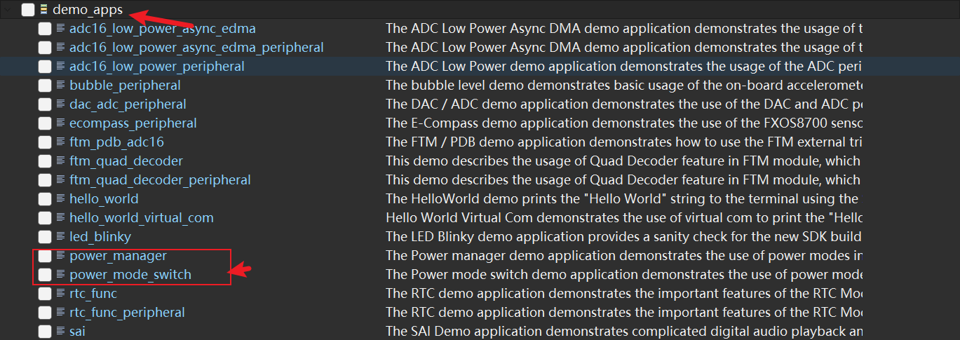 在FRDM-K66F有多种低功耗,在上次中我们已经成功将SDK包获取,我们要将其中的低功耗的内容寻找一下,其中在demo中有俩个例程