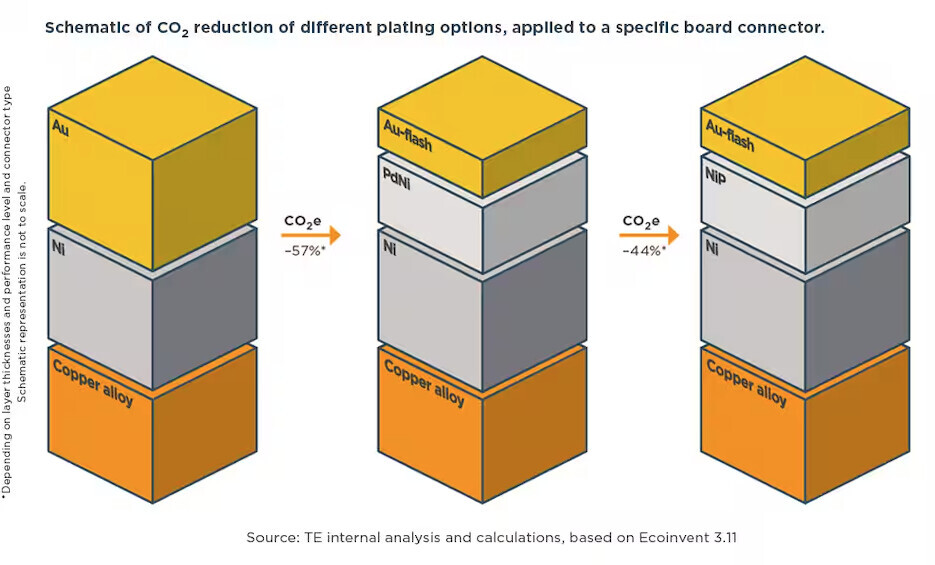 TE的内部测试与测算表明,将传统纯金镀层替换为 ECONIDUR 工艺后,二氧化碳排放量最高可减少 76%。当然,实际的环境影响会因具体应用场景、镀层厚度、连接器类型和引脚数量等因素而有所差异。