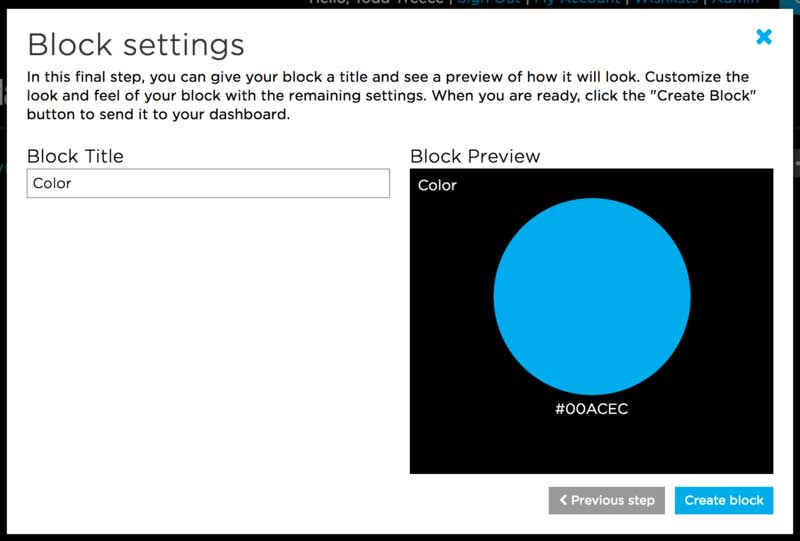 Next, add a new Color block to a new or existing dashboard. Name the block whatever you would like, but make sure you have selected the Color feed as the data source for the block.