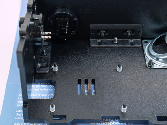Take the remaining pair of plastic brackets and attach one to each side of the underside of the console, using the centre holes of the three on the brackets, with two metal M3 nuts and bolts.