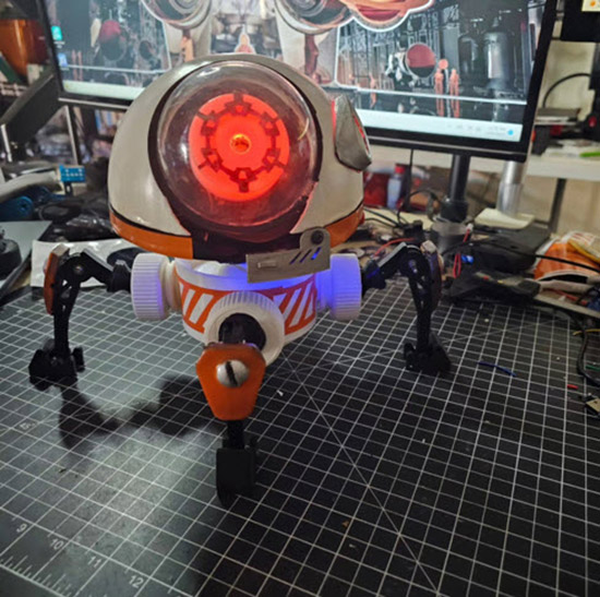 I have a unique way of characterizing the eye by dividing it into three parts: first, a person sensor; second, an eyelid covering the LED; and third, a final covering that I printed in white and painted the upper area black. This gives the eye a cool feature.