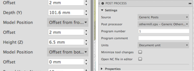Click on the arrow next to the "Brass" setup, you'll see several items (Face1, 2D Pocket, 2D Contour, etc.). Now you can right-click on each item and select "Post Process". In the Post Process panel, choose othermill.cps in the Post processor section. Then, click OK. Rename the file, relative to the tool (ie. brass-face-1-8.nc). You can tell which sized tool is being used when you right-click to edit the item (ie. Face1) and see under the Tool tab. Do this for each item (export via post process).
