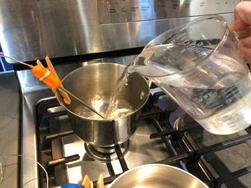 With the pots positioned on two equal sized burners, turn up the heat to high. If you are using a gas range, make sure there is no danger of the probe, clothespin, or wire being in direct contact with the open flame.