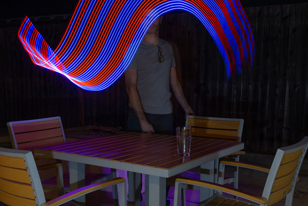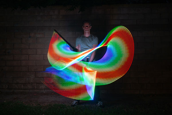 Now, you get to start experimenting! Start off simply, with a rainbow pattern. In a dark environment, set up your camera, trigger the shutter, get in front of the lens, turn on your Light Paintstick, and sweep an arc shape over your head.