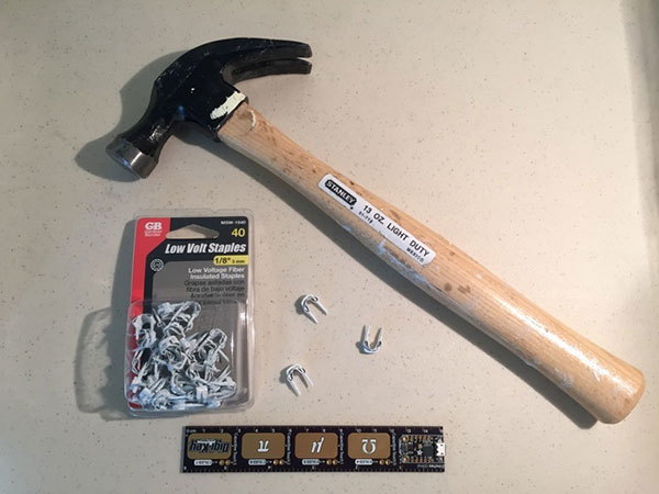 This picture shows some additional tools you will need. The hammer, shown on top, is used for final placement of the cable staples discussed above.