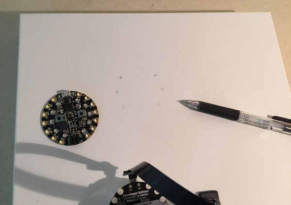 I think one set of the nylon screw parts will be enough to keep the Gemma M0 attached to the canvas. These pictures show how I marked a spot on the canvas to attach the Gemma M0 through the hole near the 'A' in 'GEMMA' on the silk screen.