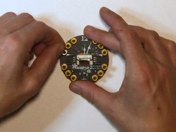 Place the Circuit Playground on top of the Gizmo, sandwiching the battery inside, with the USB port lined up with 12:00. Thread the included screws loosely in all 12 holes before tightening them all down at once.