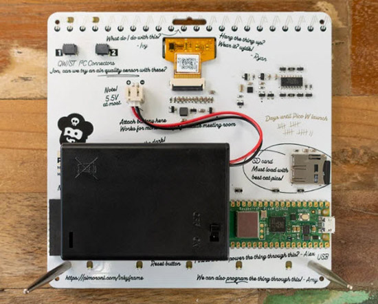 Inky Frame is a luscious, 7 colour, 5.7" (600 x 448 pixel) programmable E Ink display, powered by Raspberry Pi Pico W. It can go into a deep sleep mode between updates to preserve battery and can be woken back up with a button press or on a timer using the onboard Real Time Clock (RTC).