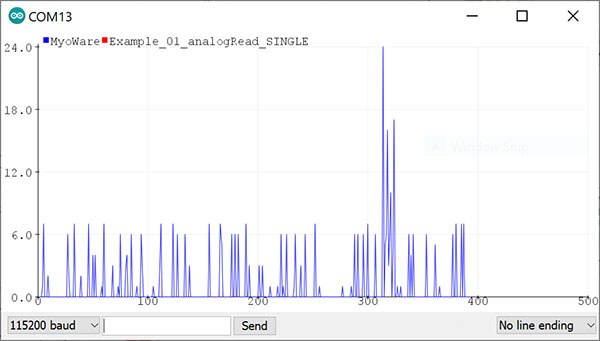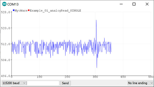 For users looking for a graphical view of the output, close the Arduino Serial Monitor for the ‎Bluetooth set as the Central device (i.e., the RedBoard Artemis receiving the sensor data). Then ‎open the Arduino Serial Plotter. You should see something similar to the output below. In this case, ‎we flexed our forearm muscle causing the values to increase. Relaxing the muscle caused the ‎values to decrease.‎