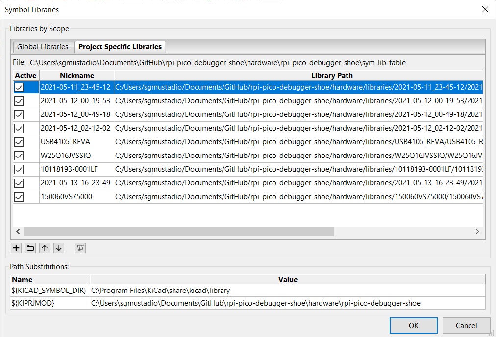 Next, go to Preferences > Manage Footprint Libraries. Go to the Project Specific Libraries tab. Click the folder button to Add existing library to table. Select the .pretty folder in each downloaded library. Note that the .pretty folders in the Ultra Librarian libraries will all be named footprints.pretty. To avoid conflicts in your library manager, I recommend changing the Nickname to reflect the part name (e.g. rp2040). Click OK to save.