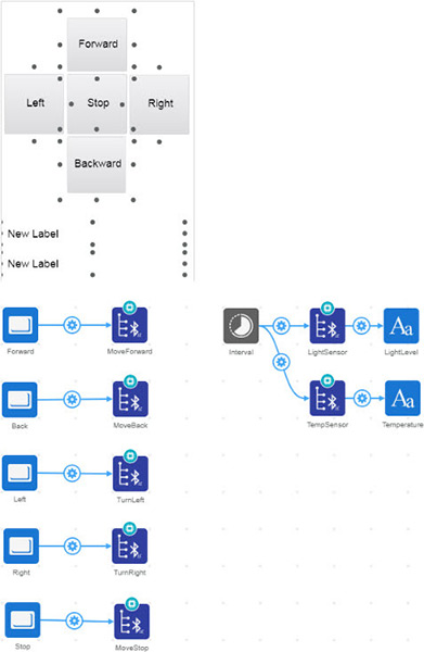 The application side of the project is designed to be used as a controller with a button layout that shows each movement; forward, reverse, turn left, turn right, and stop. When these buttons are pressed, the corresponding Bluetooth element sends the message “GO,” which causes the connected Bluetooth element on the app to trigger the H-bridge element. However, this message is not important (and could be anything), as the Bluetooth elements on the app change the state of the H-bridge when written to. The app also includes two labels that display the recorded temperature surrounding the robot as well as the light level. The interval element is used to probe the light sensor and temperature sensor Bluetooth elements for data, which is then passed to their respective labels.