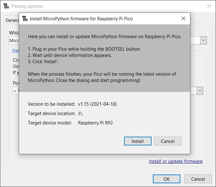 Open Thonny. If you do not already have the MicroPython firmware running on the Pico, click on the bottom-right button and select the Raspberry Pi Pico as your board. Click again and select Configure Interpreter. In the pop-up window, select Install or update firmware.