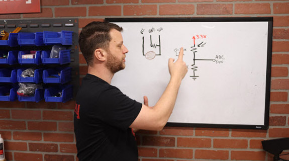 So, to get started, I need to make a voltage divider circuit using the photoresistor that I can read with the microcontroller. I'm also going to connect up the SparkFun TEMT6000. Once I get that working, I can take the BME280, which is the temperature pressure and humidity sensor, and solder that to the board. Here is the circuit diagram for the photoresistor in the voltage divider. I basically need to put a photoresistor and a regular resistor in series between 3.3V and ground. The photoresistor I’m using has a range between 0 and 20k Ohms, so for the other half of the voltage divider, I decided to use a 1k resistor. If I measure between the two resistors, I'll get a varying output voltage that I can read using the ADC pin on my microcontroller. When it came time to connect the light sensor to the microcontroller, I decided to chop the end off of a servo extension cable. These cables are readily available and already have the three pins that I need. I put a little dab of CA glue and I secured the connector in place.