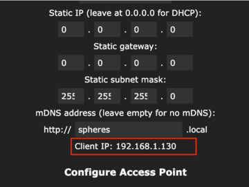 Pop back over to WLED (http://spheres.local) and go to Config > Wifi Setup. Scroll down until you find the IP address of your device. Copy it into your clipboard.