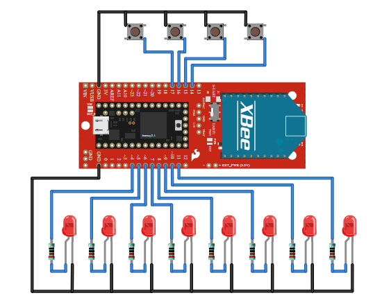Checks for received data from the XBee. If a number 1-8 is received, the associated LED on pins 14-21 is illuminated. If any other character is received, all 8 LEDs are are switched off.