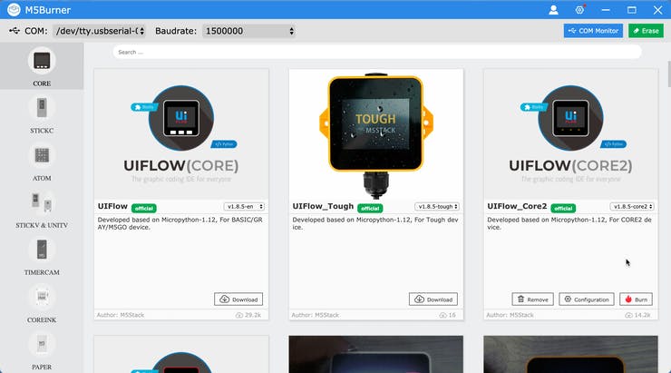 - Download and install the M5Burner, which is a tool for the firmware writing in accordance with the M5Stack module you are working.