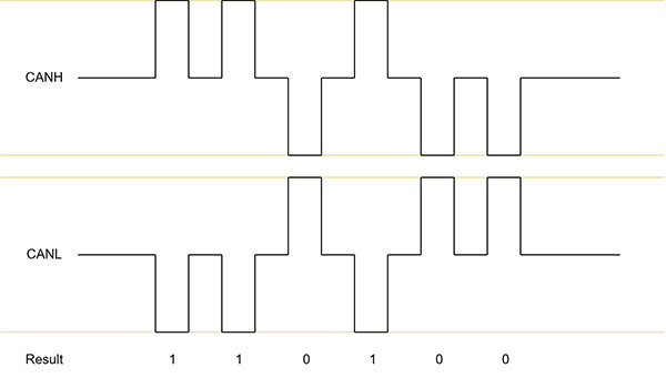 CAN uses two wires for communication, CAN High (CANH) and Can Low (CANL), which form a differential pair to provide enhanced immunity against noise and to increase the reliability of data transfer. A differential pair comprises two electrical conductors that carry complementary signals. Additionally, the voltage of one wire is the inverse of the other. When transmitting a logical zero in CAN, the voltage on CANH is lower than on CANL. Conversely, when sending a logical one, CANH carries a higher voltage than CANL. The voltage difference represents the transmission of data bits.